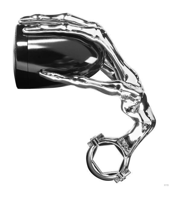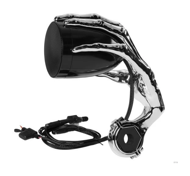 - Chrome 3″ full range weatherproof speakers with custom tooled skeleton hand