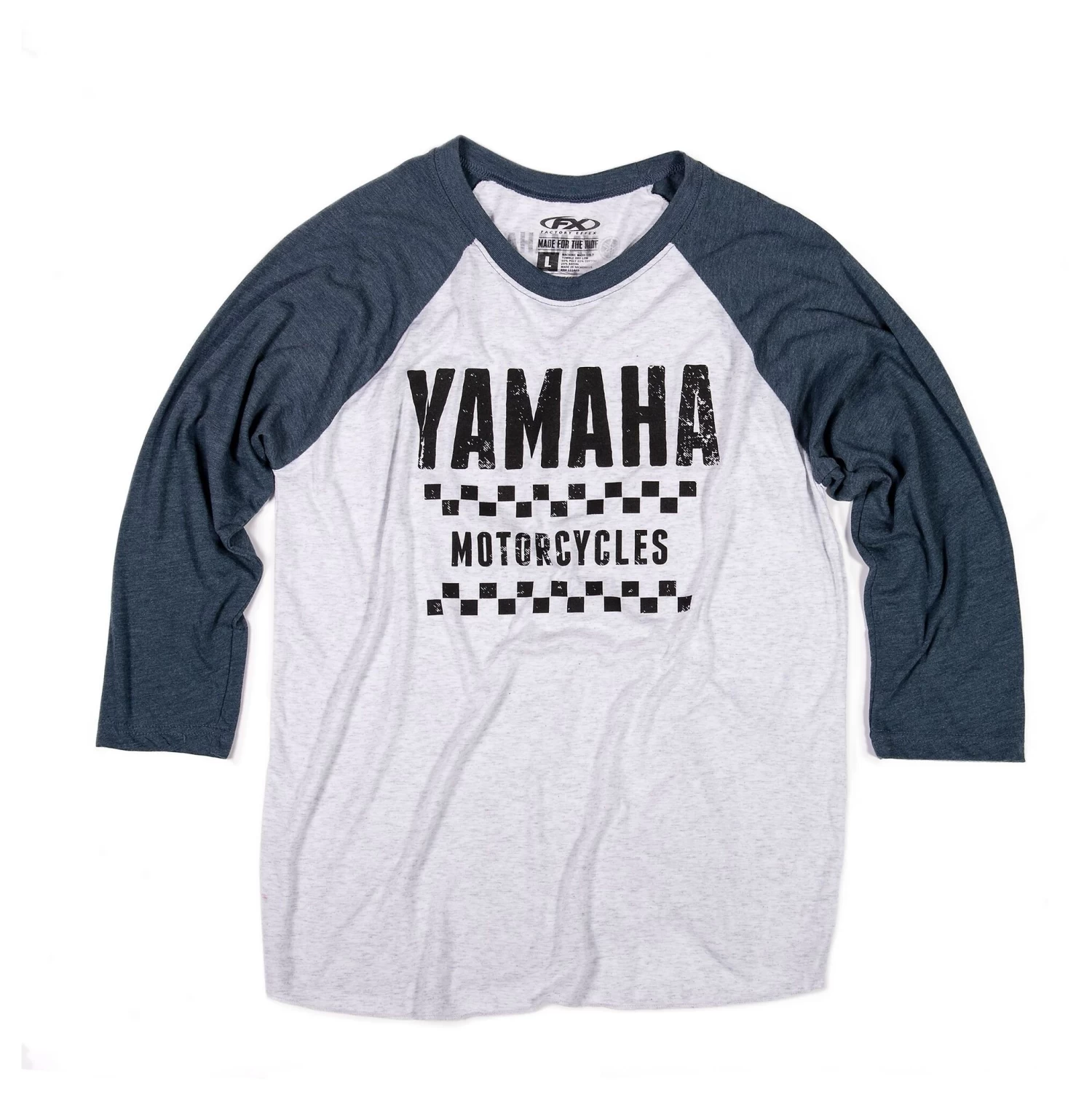 Officially licensed Yamaha 3/4 raglan sleeve baseball shirt. Contrasting ribbed collar and sleeves. Double-needle stitched sleeves and bottom hem.