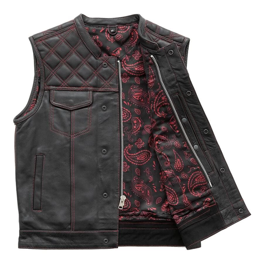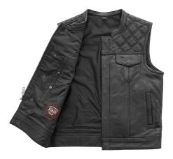 The First Manufacturing Downside Vest is an all leather club style vest, that fits just like the Sharpshooter and other standard club vests. It’s got a one-inch collar, and cropped center zipper for comfort while sitting on the bike. A mesh lining keeps you comfortable, and also has an easy access zip so you can easily add patches or embroideries.