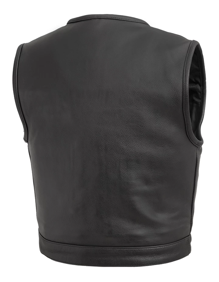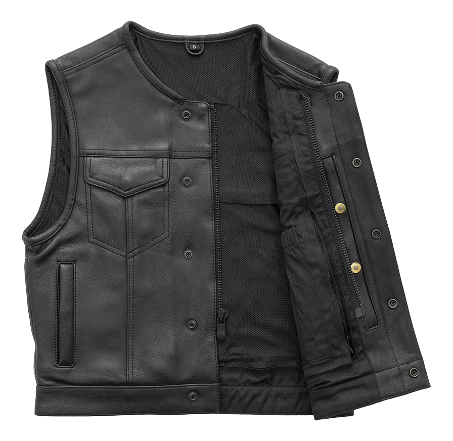 The First Manufacturing Lowside Leather Vest is a short club style platinum cowhide leather vest, featuring mesh lining for easy access to the back panel for patches and embroideries.