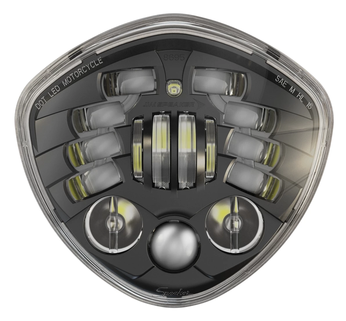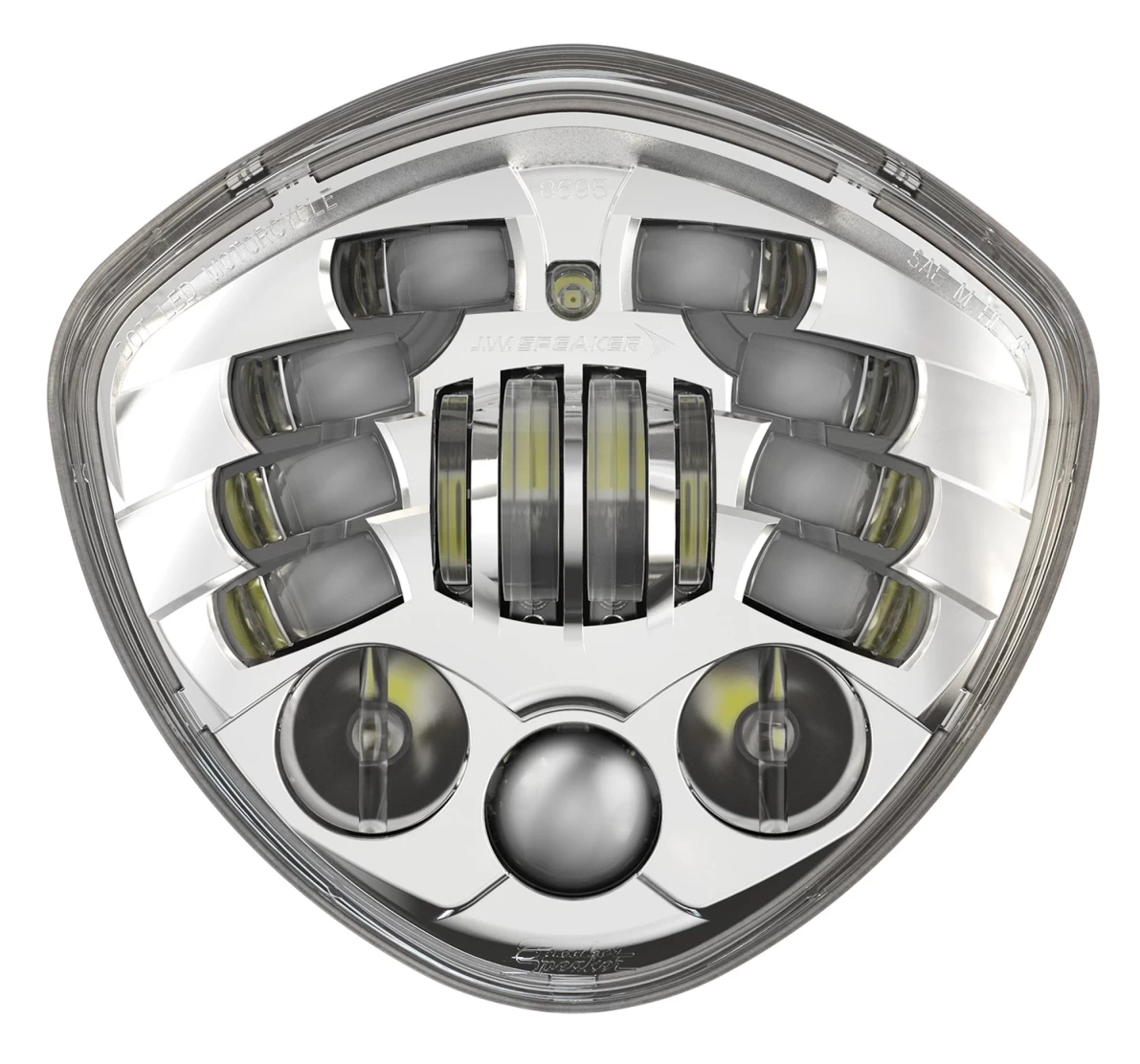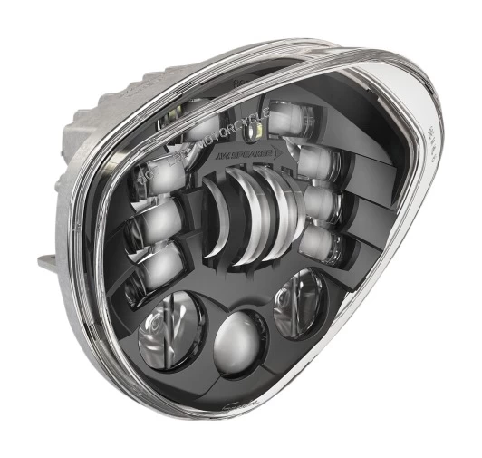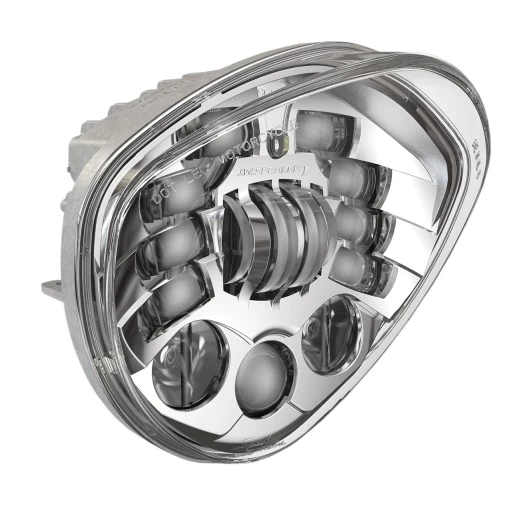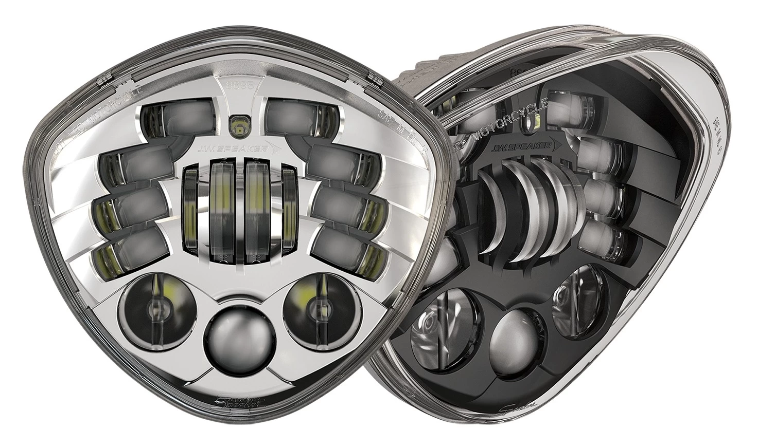 Offering the same great functionality of the J.W Speaker Adaptive Series headlights, the Model 8695 Adaptive 2 offers a dynamically adaptive LED headlight designed to fit Victory motorcycles, featuring the diamond shape unique to this application. The Adaptive 2 Series uses proprietary technology and on-board sensors to calculate bank angles on a real-time basis, automatically directing the light array up or down as the motorcycle leans, and continues to illuminate through corners even with the high beam on. This additional illumination fills in the gaps to the left or right of the motorcycle that traditional headlights can’t. The Model 8695 Adaptive is designed to fit Victory motorcycles with their one-of-a-kind diamond shaped headlight offering riders plug & play installation. Built with high-quality LEDs, ComfortLite high beam optics and adaptive technology to produce a superior beam pattern and dramatically improve rider comfort and safety. Heavy-duty, die-cast aluminum housing and state-of-the-art LEDs not only deliver premium performance, but also give a bike a truly unique look.