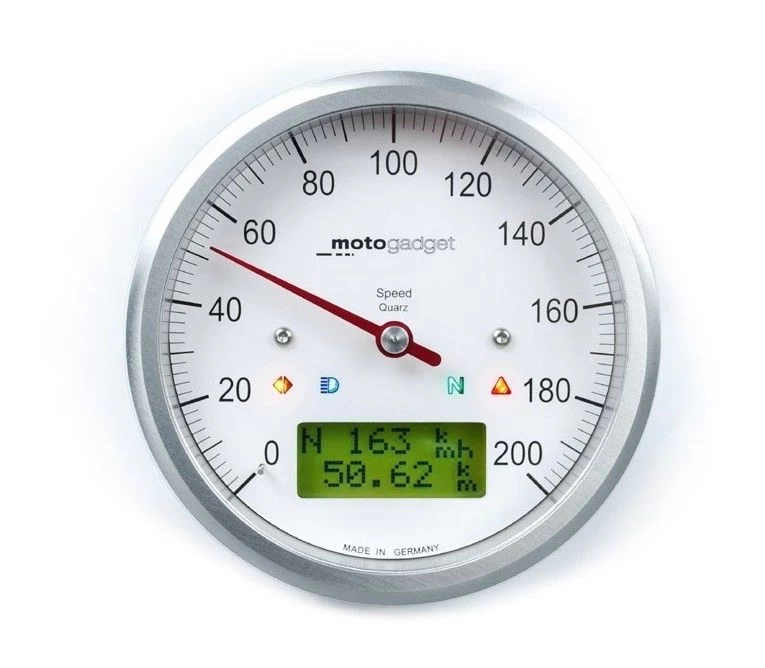 The Motogadget Motoscope Classic is a digital multi-purpose instrument in a classic round casing. A White dial is contrasted by a Red indicator for timeless good looks.