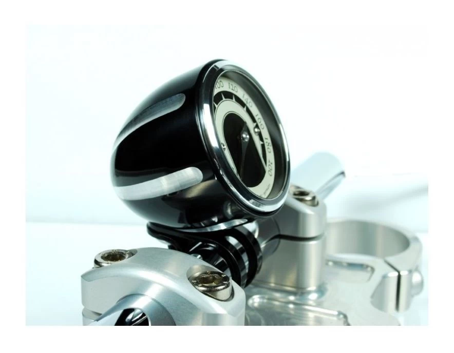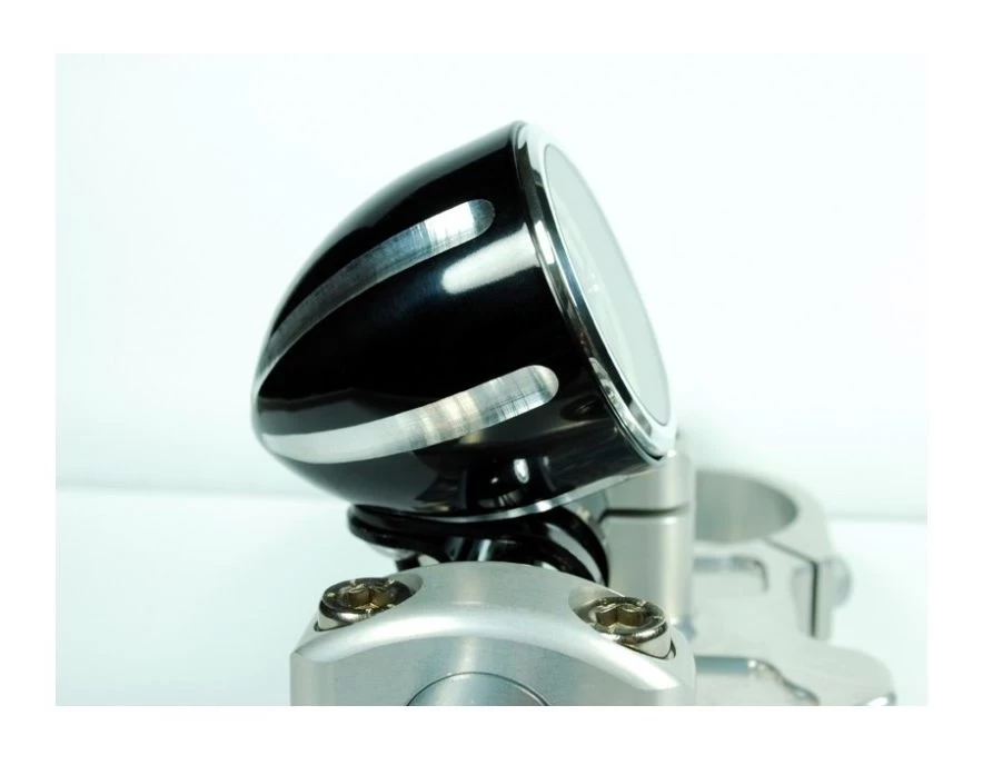 An elegant contrast cut handlebar mounting cup for the Motogadget Motoscope Tiny. This great looking piece of kit is lathed and milled from billet aluminum and black anodized for a lasting finish. Available for 1″ and 7/8″ handlebars.