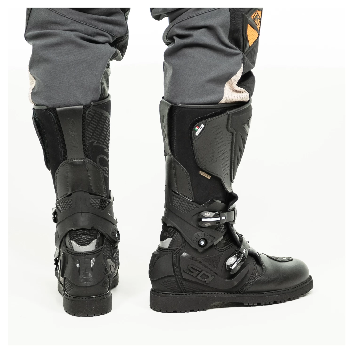 Most salient of the improvements Sidi has made with the redesign of the Adventure 2 Gore-Tex Boots is the full-height 14 inch Gore-Tex gaiter, which now extends 3 inches higher up the shaft for increased waterproofing – especially useful when fording water crossings. With additional stretch at the back of the calf, there is now more space and flexibility in the shaft to accommodate a wider range of rider’s calf-sizes. SIDI has also increased the area of split-grain leather grip paneling on the inside of the calf as well as the instep for better feel when standing on the pegs off road.